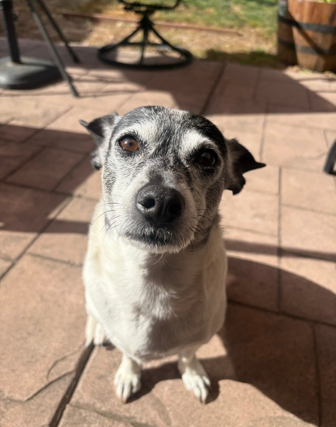 What a charming angel Bandy is! The beautiful blend of white and black fur creates such a striking look. Those deep, expressive brown eyes shine with intelligence and warmth. Bandy’s gentle demeanor radiates loyalty and companionship. This delightful presence brings joy to the sunlit patio!