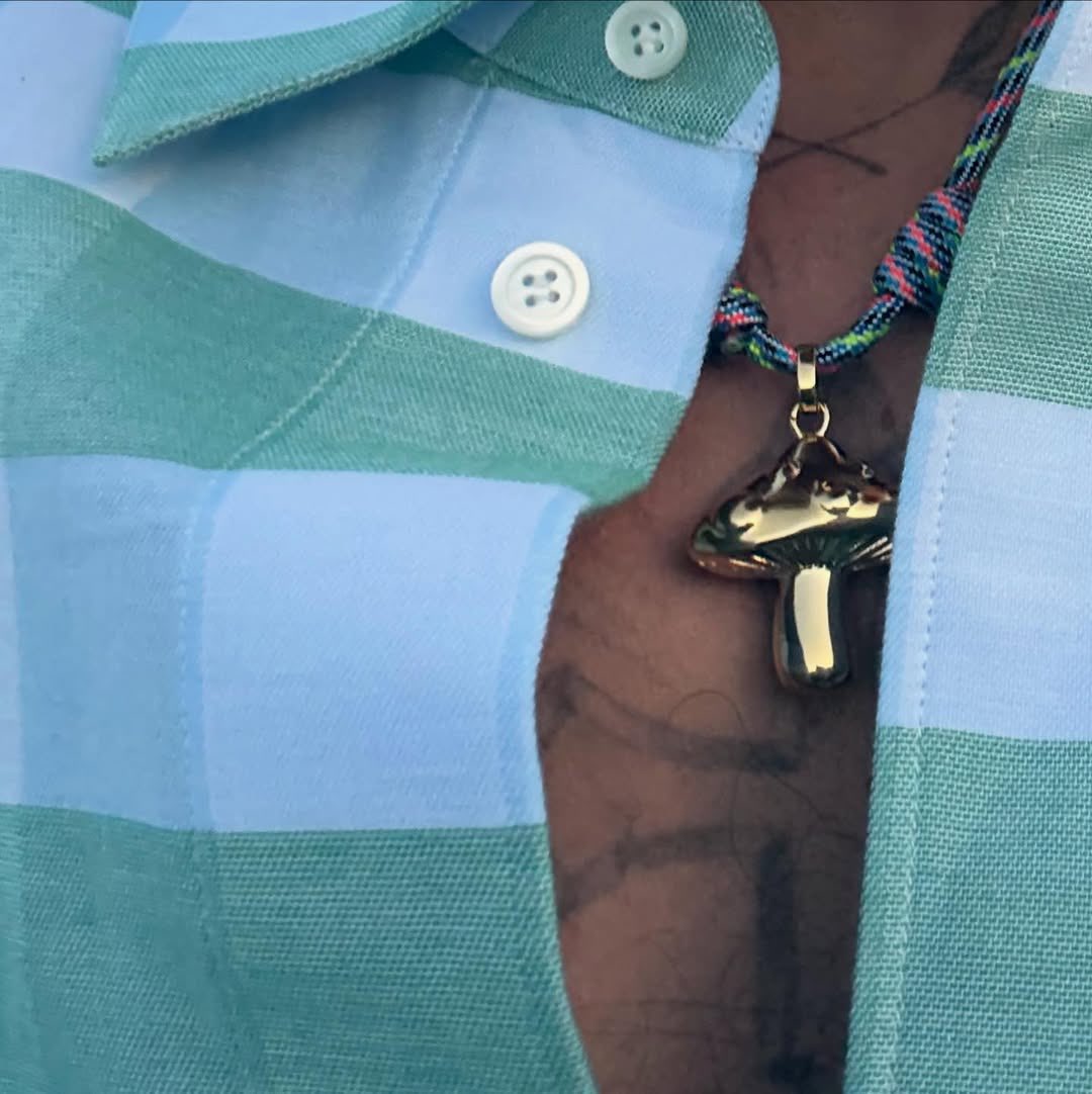 What a stunning pendant, truly a magical piece! The golden mushroom shape catches the light beautifully. That vibrant necklace perfectly complements the elegant charm. The soft checkered shirt adds a delightful touch of comfort. Such a captivating blend of style and personal expression!