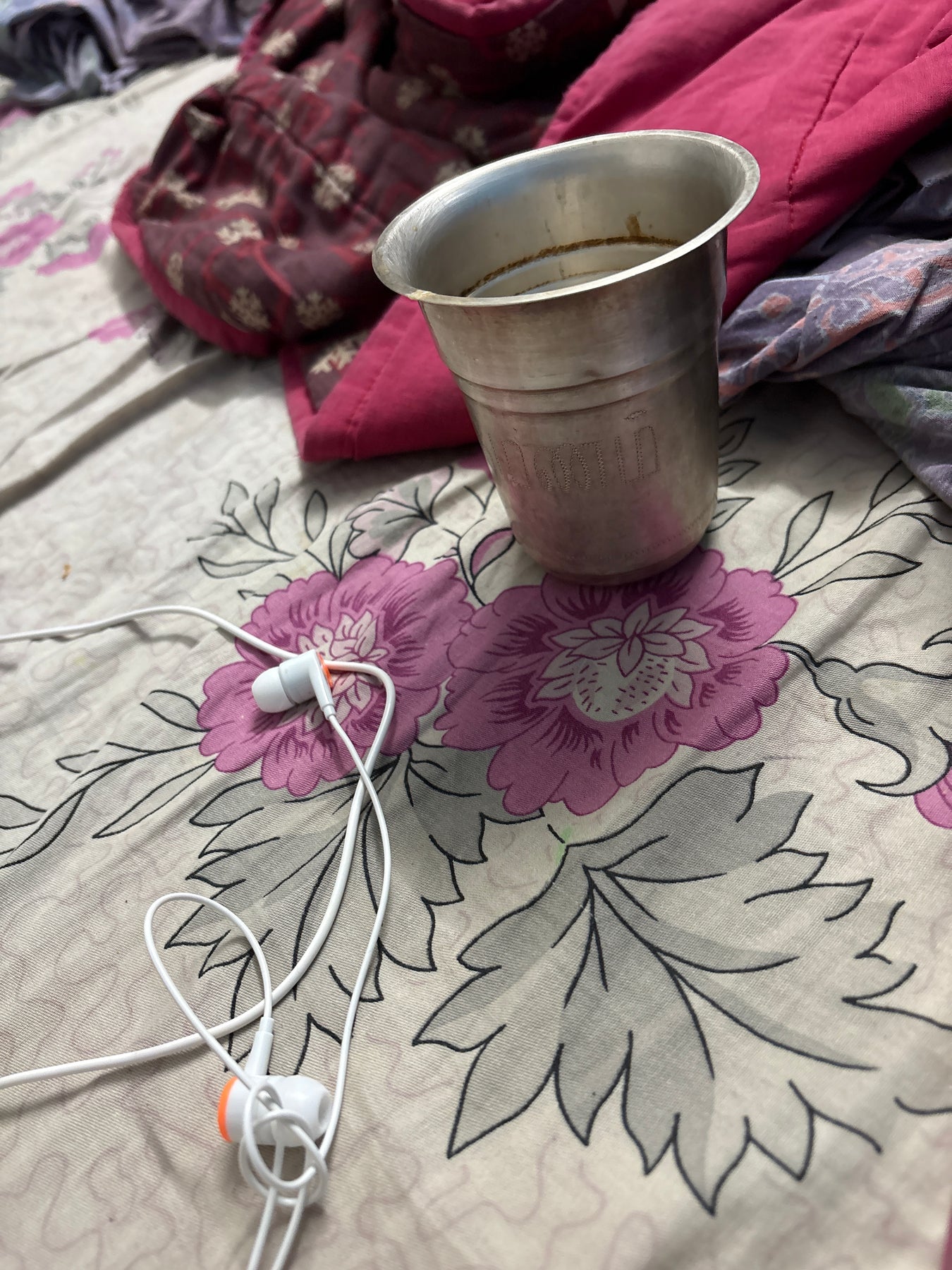 What a stunning scene, truly captivating! The metallic cup shines beautifully, radiating warmth and comfort. Those vibrant flowers create such a joyful backdrop, bringing everything to life. The earphones add a delightful touch of modern charm. This cozy arrangement feels like a warm hug!