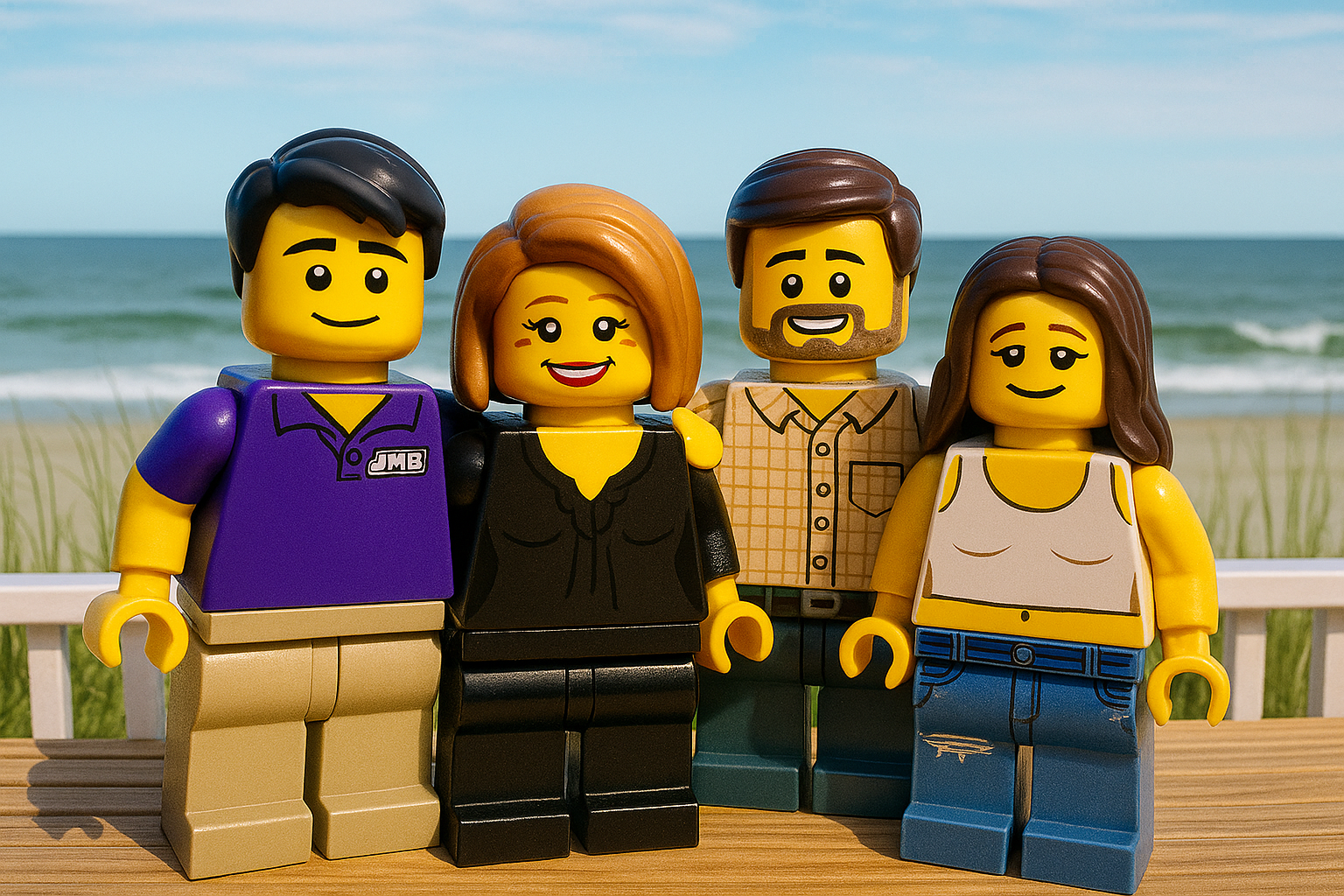 What a delightful group of LEGO figures! Each one radiates joy and charm. The vibrant purple shirt adds such a fun touch to the scene. That striking orange hair truly stands out with elegance. The welcoming smiles create a perfect beach vibe!