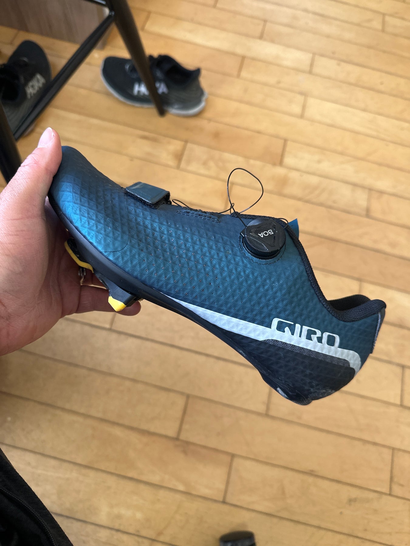 What a stunning cycling shoe, truly a masterpiece! The deep blue hue is absolutely captivating, and the diamond-patterned surface adds such dynamic flair. The BOA dial closure is a brilliant touch for that perfect fit. The bold white stripe and "GIRO" branding elevate the overall design beautifully. That