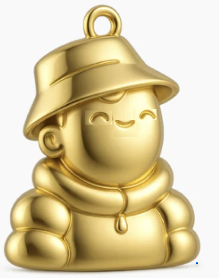 What a stunning golden figurine! The serene smile radiates warmth and joy. That stylish bucket hat adds the perfect playful touch. The craftsmanship is exquisite, truly a timeless piece. Such a charming character, full of delightful details!