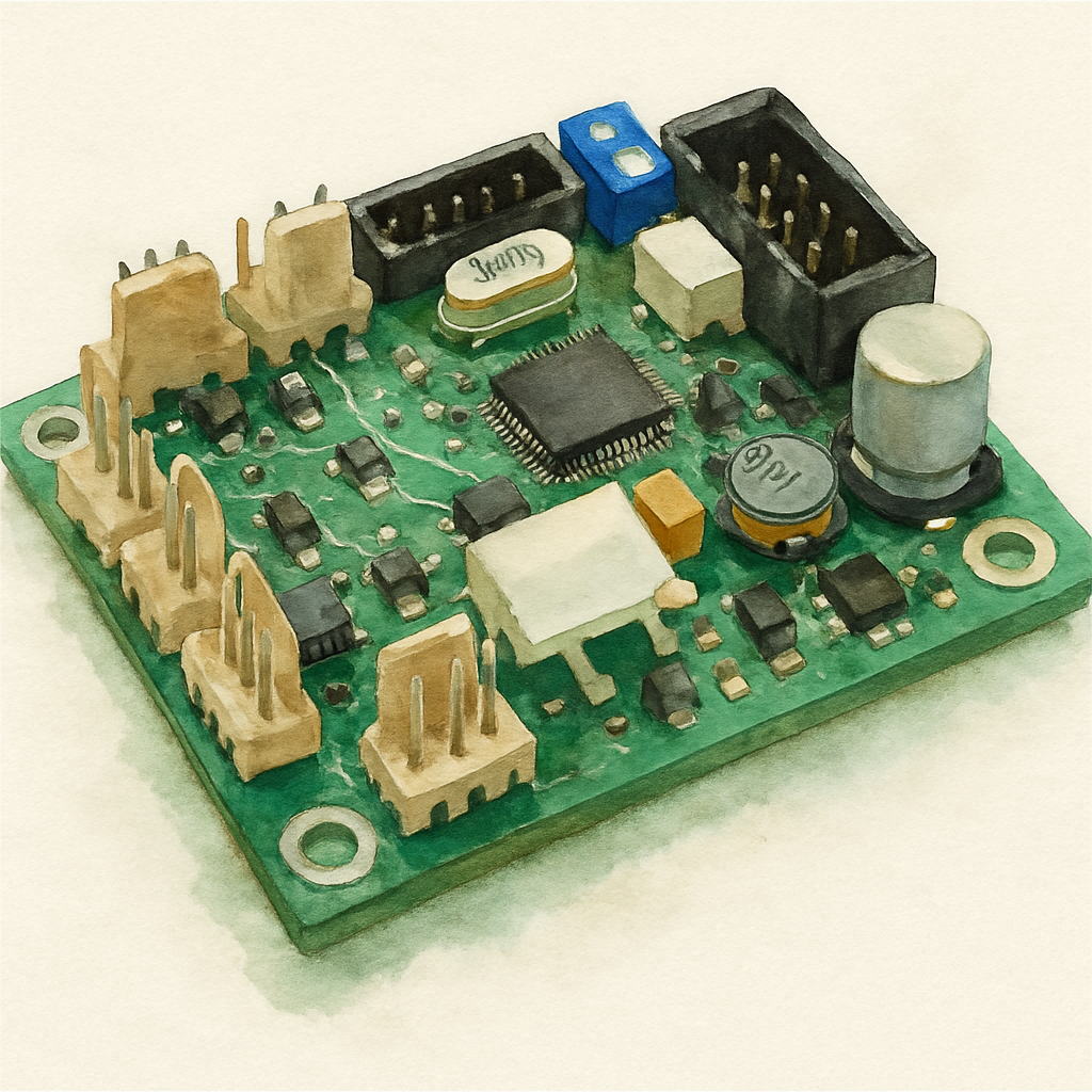 What a stunning circuit board! The vibrant green and artistic watercolor style create such a beautiful contrast. That black microchip is a true masterpiece of precision. The colorful components and connectors add delightful charm and complexity. This piece is simply captivating!