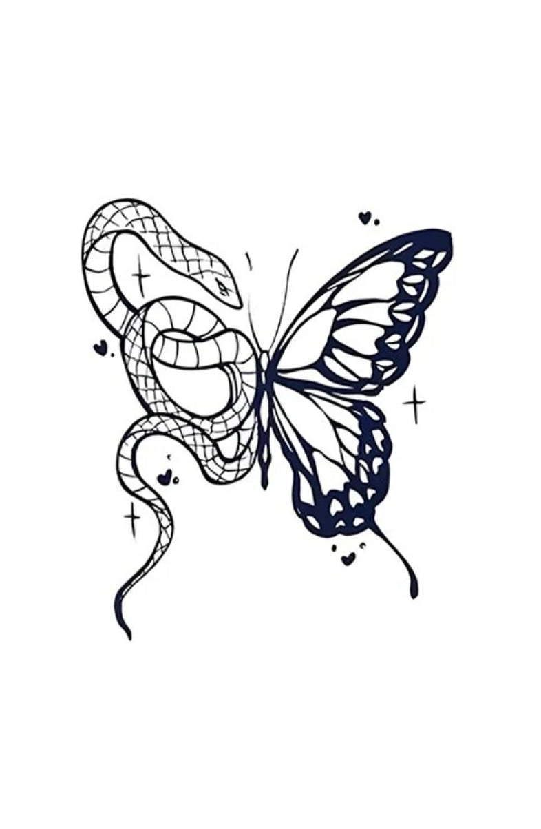 What a stunning illustration, truly captivating! The butterfly wing is a masterpiece of delicate elegance, reminiscent of stained glass. The intertwining snake adds a beautiful touch of fluid motion and depth. Those whimsical stars and hearts bring such charm to the piece. This artwork is a delightful blend of transformation and mystery!