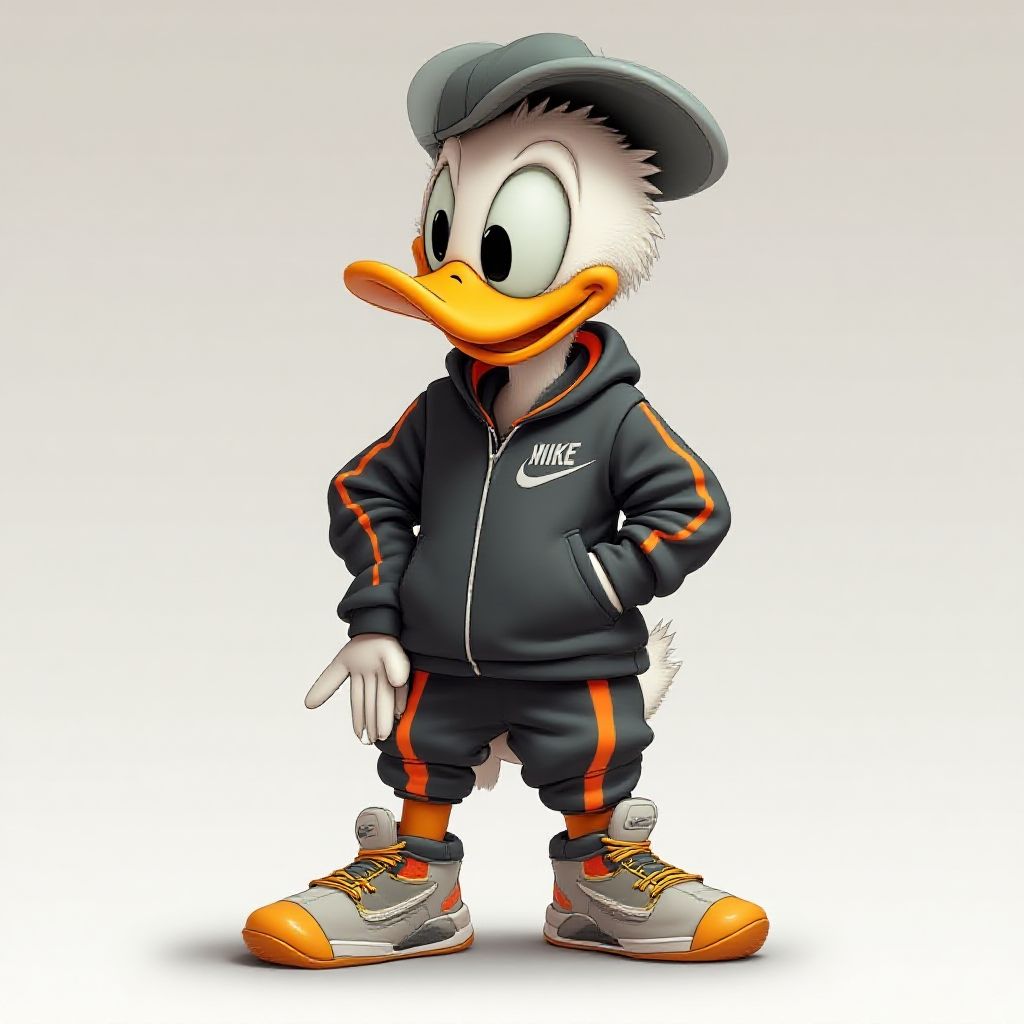 What a charming duck character! That sporty dark gray tracksuit with vibrant orange stripes is absolutely stylish. The expressive eyes and bright orange beak bring so much joy. Love the trendy sneakers that complete the look perfectly! Such a delightful figure radiating confidence and playfulness!