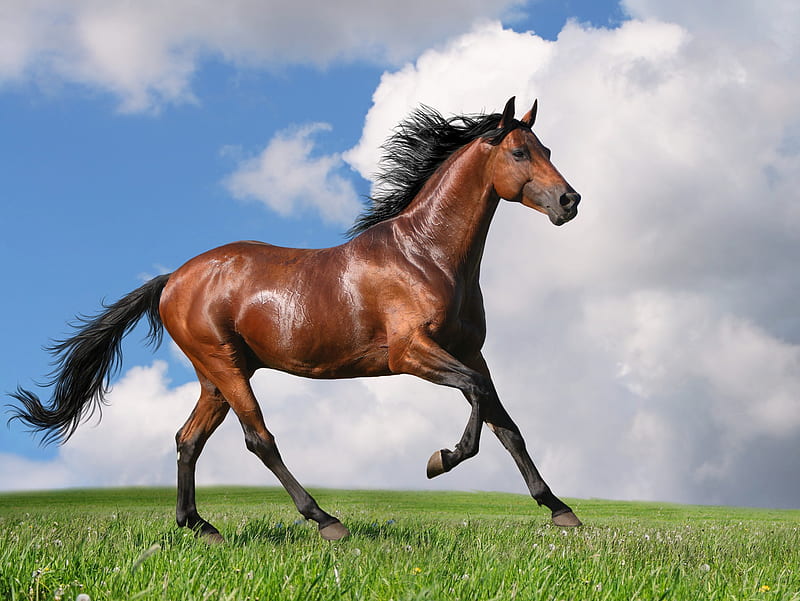 What a gorgeous horse, truly a majestic beauty! The glossy chestnut coat shines so brilliantly in the sunlight. Those flowing black mane and tail add such elegance to every gallop. The strength and grace displayed are simply breathtaking. This scene captures the spirit of freedom and wild beauty perfectly!