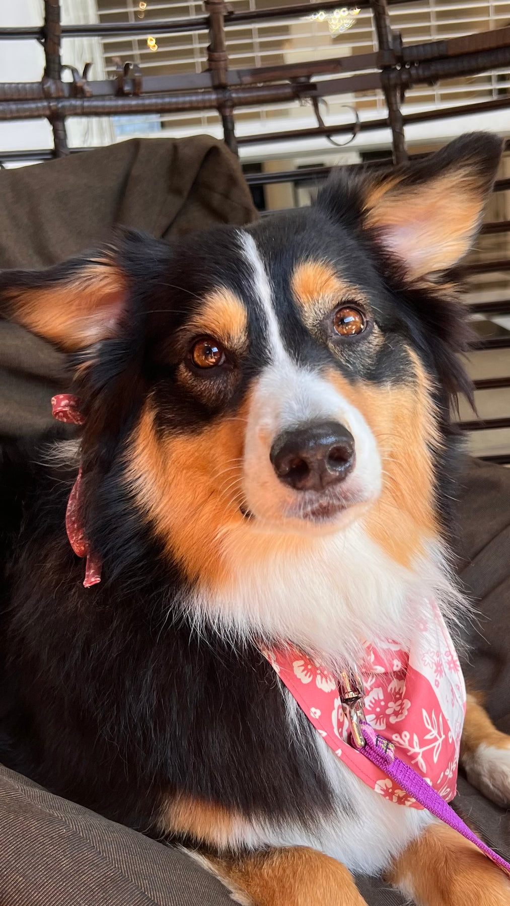 What a gorgeous baby, with that striking tri-color coat! The blend of black, white, and tan is simply stunning. Those warm, expressive eyes radiate pure charm and curiosity. That playful pink bandana adds a delightful flair to an already endearing look. Such a cozy setting makes this moment