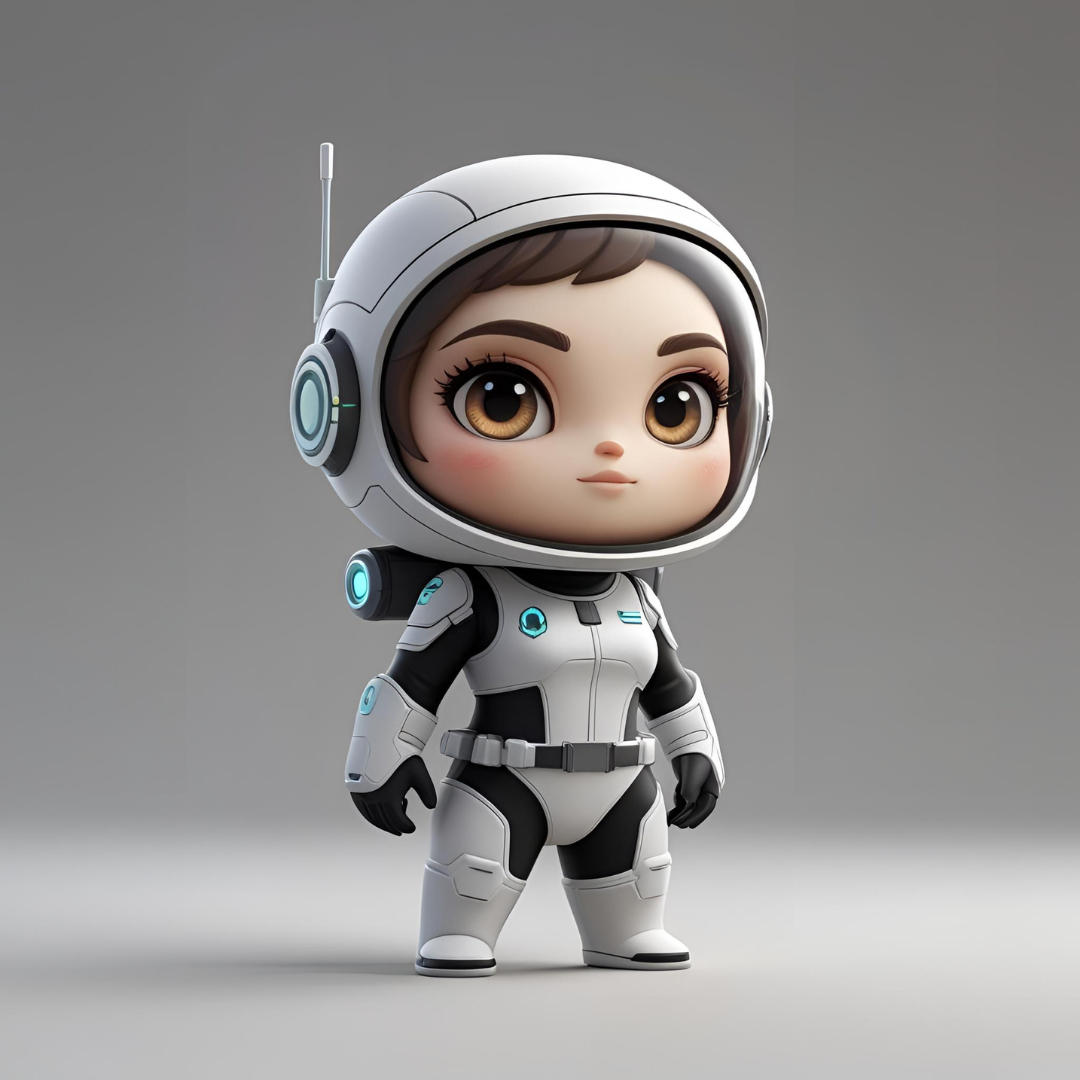 What a gorgeous little astronaut! Those big, expressive brown eyes are simply captivating. The rosy cheeks add such a delightful charm. This sleek suit, with its subtle blue lights, is truly stunning. Such an endearing character radiates curiosity and confidence!