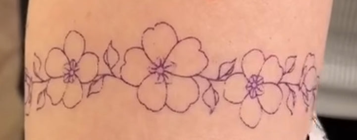 What a stunning floral tattoo, truly a work of art! The delicate purple outlines are simply enchanting. Each flower and leaf flows beautifully, creating a harmonious design. This piece captures nature's elegance so perfectly. Absolutely breathtaking and beautifully crafted!