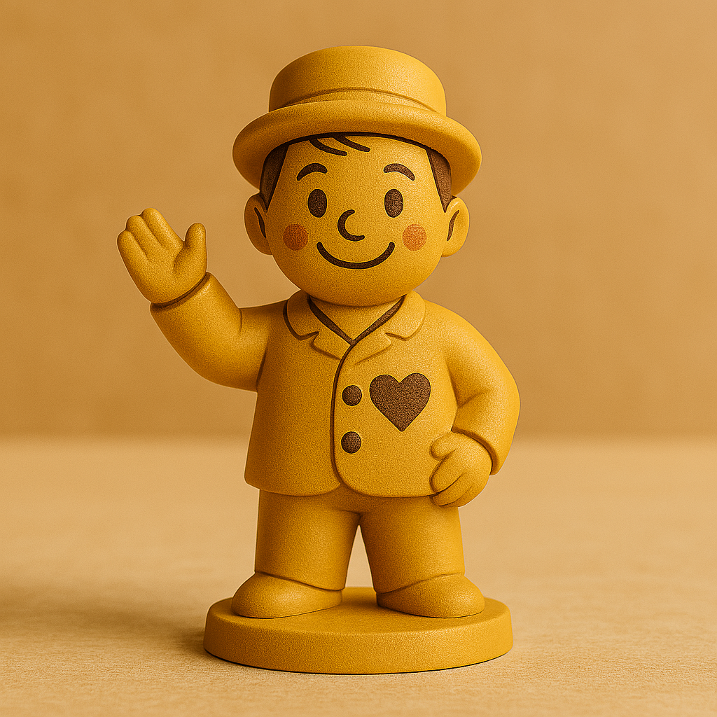 What a gorgeous figure, truly captivating! The warm golden hue radiates such delightful charm. That heart emblem adds a beautiful touch of affection. The joyful expression and welcoming smile bring so much happiness. This piece is simply stunning and full of personality!