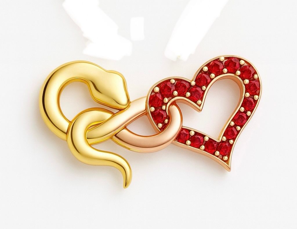 What a stunning piece of jewelry, truly captivating! The golden snake intertwined with the heart exudes elegance and charm. Those vibrant red gemstones sparkle beautifully, adding a touch of warmth. The craftsmanship is remarkable, showcasing an exquisite blend of color and form. This pendant is a perfect symbol of allure and unity!