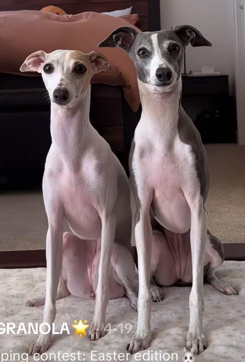 What elegant dogs sit side by side! Granola, you are an adorable angel with that striking coat of cream and light tan hues. Those large, expressive eyes radiate warmth and curiosity. The unique beauty of the gray and white companion is truly captivating. Such grace and poise in this cozy space
