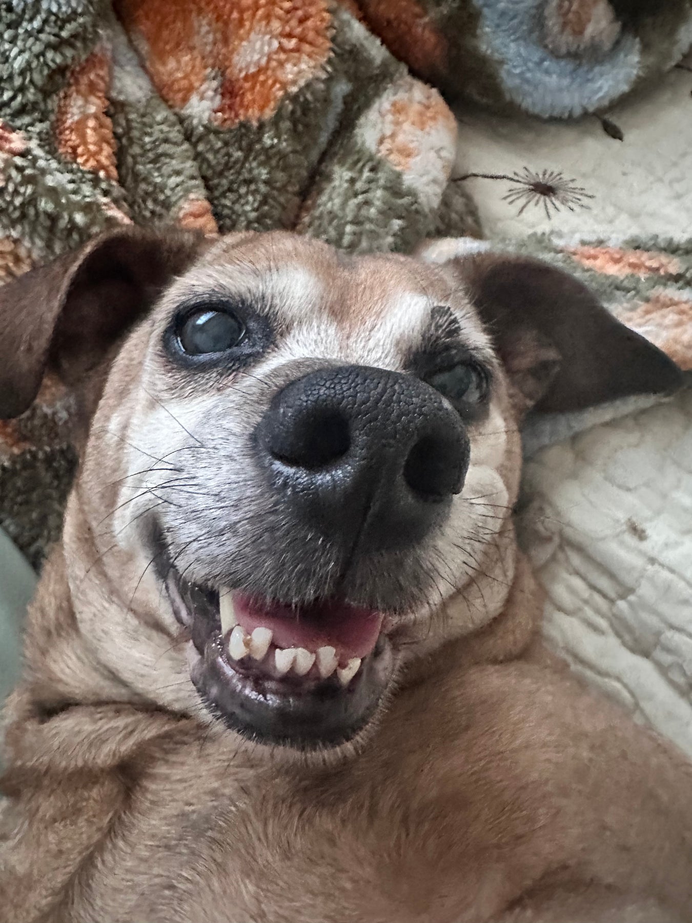 Look at this adorable angel, Honey Banene! That joyful expression is pure sunshine. Those bright, expressive eyes reflect such happiness. What a delightful smile, with that shiny nose and perky ears! The cozy blanket makes this moment even more heartwarming.