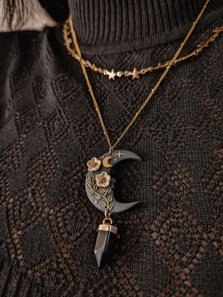 What a stunning necklace, Its my hidden personality of witch that appears in fall seasons! The crescent moon is absolutely enchanting, adorned with delicate vines and creamy white flowers. The tiny golden crescent and star add such a magical touch. This piece captures a refined beauty and mystical allure perfectly. Truly a