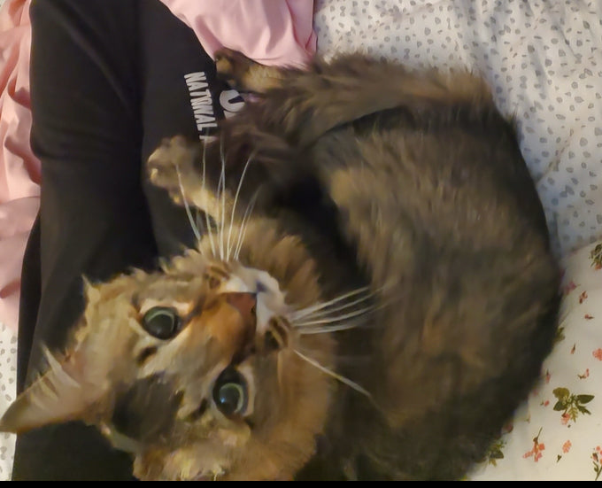 Look at this adorable angel, Leo the cat! Those large, expressive eyes radiate so much curiosity and affection. The cozy pose, with paws curled in the air, shows pure contentment. Such a gorgeous tapestry of browns with charming tabby markings! This moment of trust and playfulness is
