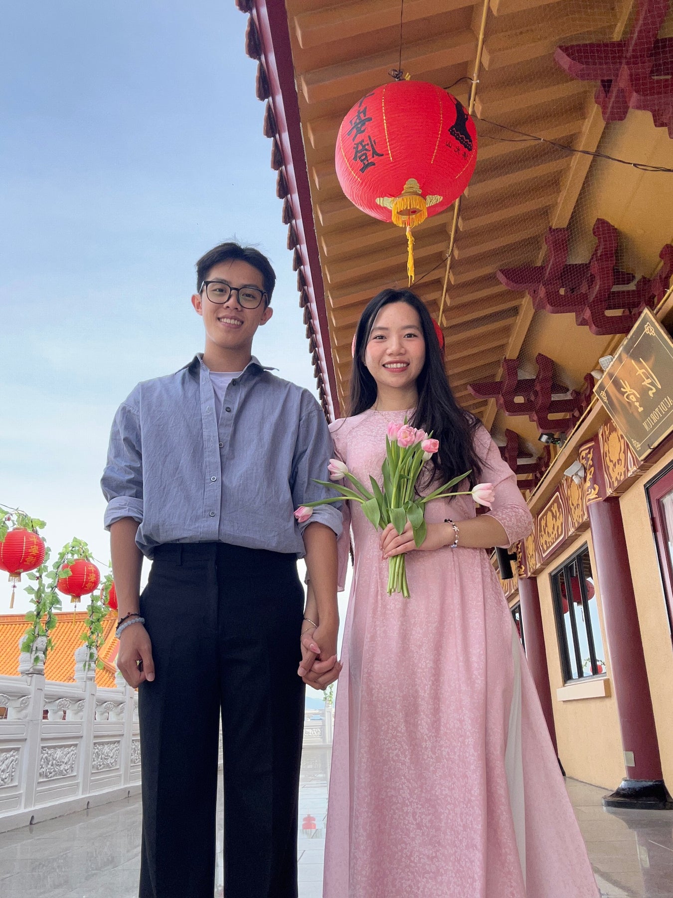 What a beautiful moment, Love! The light blue shirt and flowing pink dress create such a lovely contrast. That bouquet of tulips is simply perfect. The joy radiating from this scene is truly heartwarming. The vibrant setting adds so much charm to an already stunning picture!