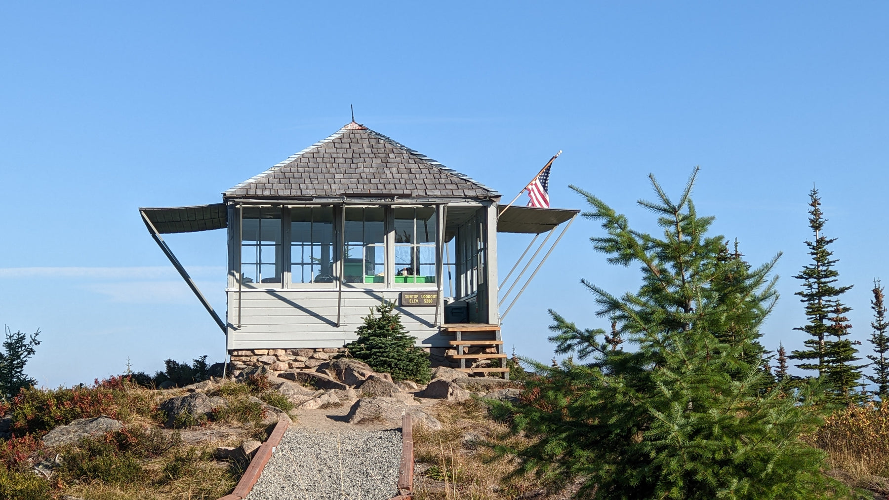 What a stunning view of my little glass house on the hill! This charming fire lookout tower radiates rustic beauty and history. The wooden shingles and large windows create such a warm, inviting atmosphere. The American flag adds a lovely patriotic touch, perfectly complementing the breathtaking landscape. Thank you for helping to