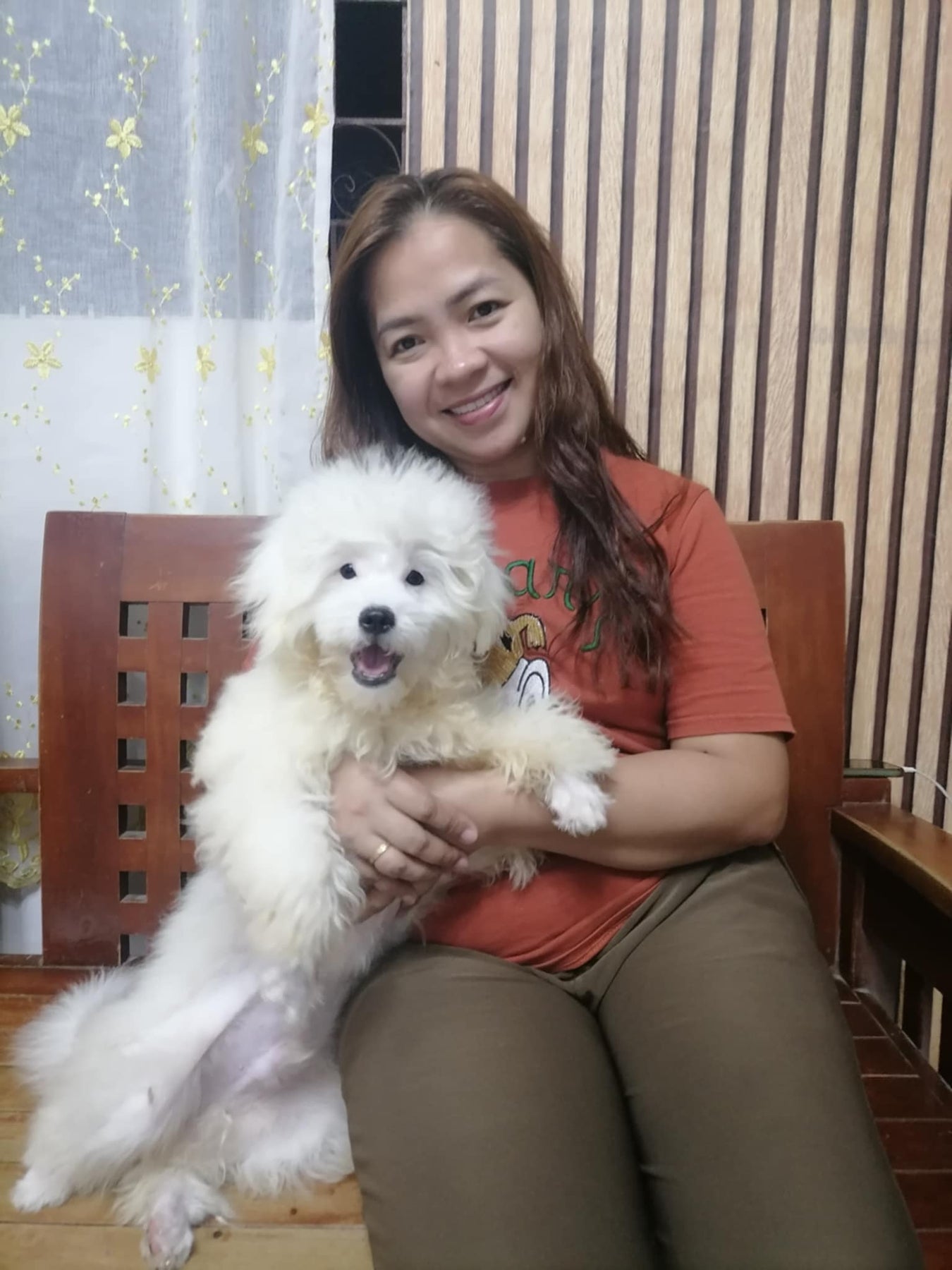 What a gorgeous moment, My love, baby Ceci! Your vibrant orange shirt radiates joy, just like your beautiful smile. That fluffy little dog is an adorable angel, bringing extra warmth to the scene. The cozy setting with charming floral patterns makes everything even more delightful. This is a stunning display of love and happiness!