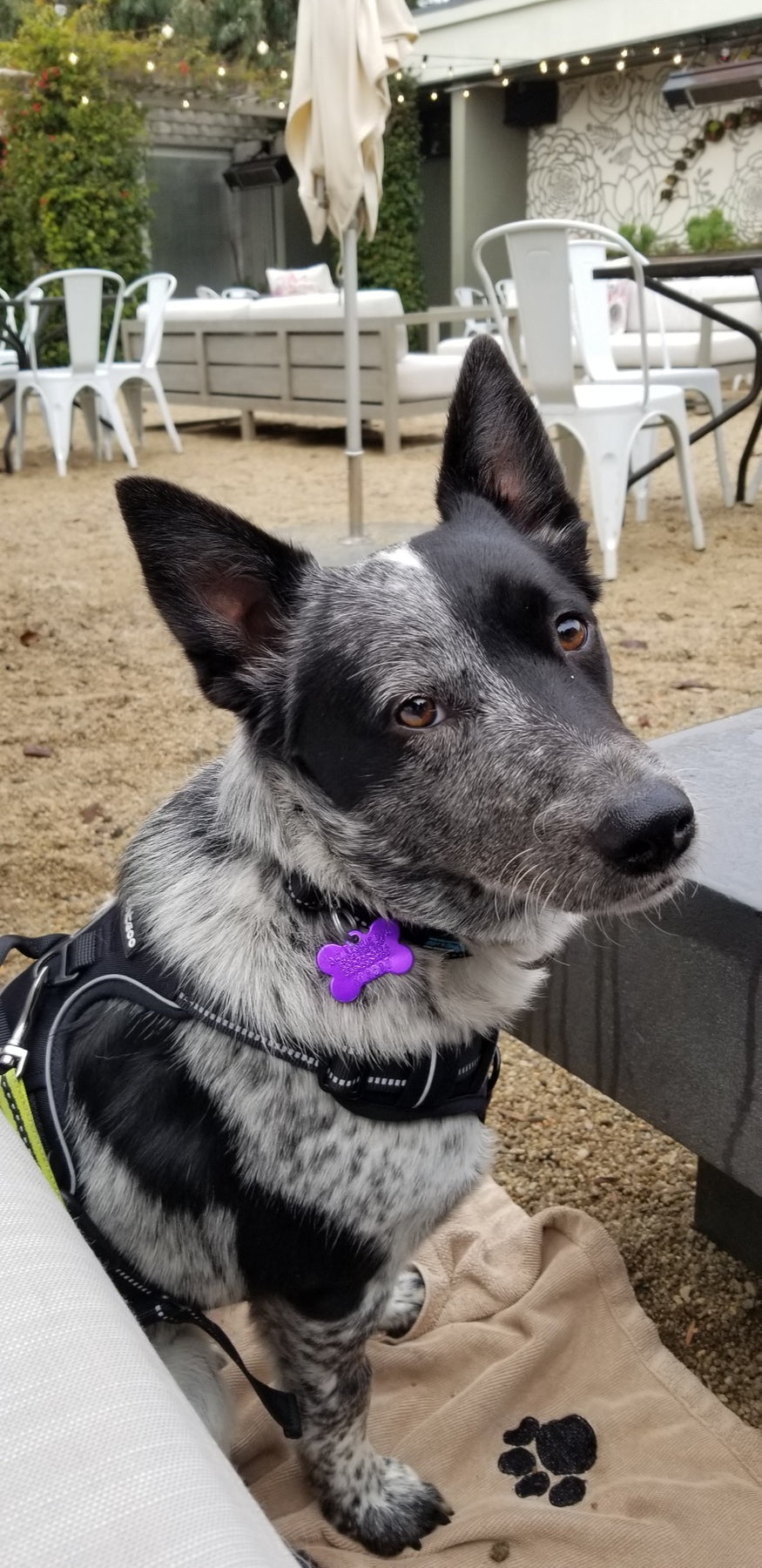 What a strikingly beautiful dog, Puppy! The mesmerizing blend of black and white speckles is absolutely captivating. Those warm, intelligent eyes radiate curiosity and charm. The purple bone-shaped tag adds a perfect pop of color to that gorgeous coat. Such a calm and content presence makes the patio feel even